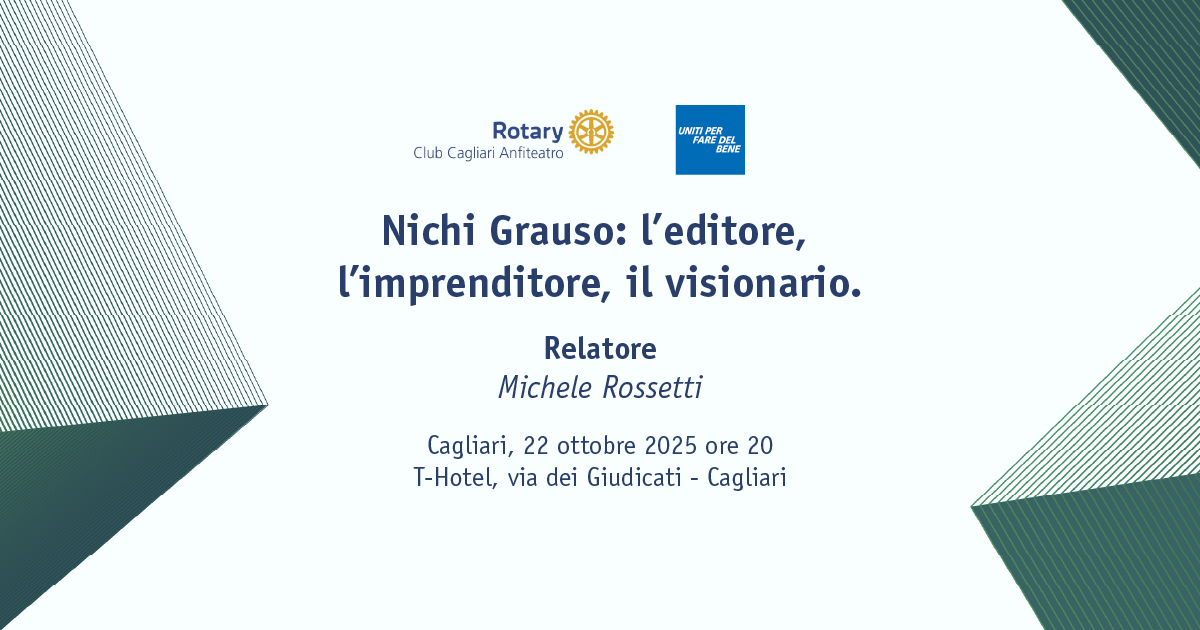 Mercoledì 22 ottobre il socio Michele Rossetti terrà una conversazione dal titolo “Nichi Grauso: l’editore, l’imprenditore, il visionario”, ripercorrendo le molteplici iniziative e le avventure imprenditoriali di una delle menti più innovative della Sardegna.